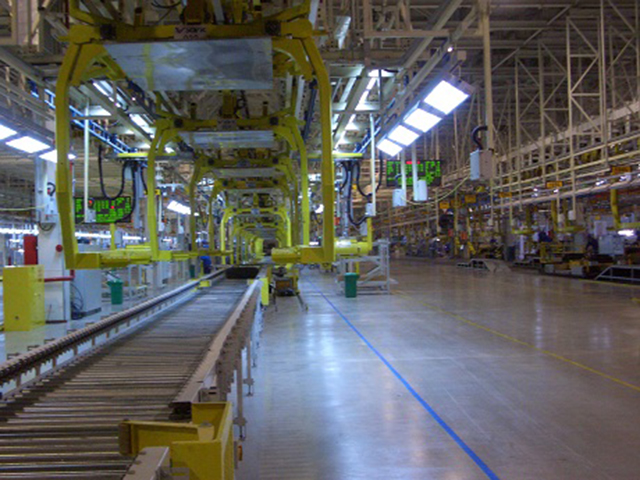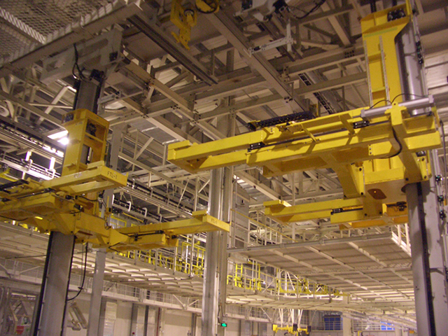 此項目總包方為日本大福,全線采用摩擦驅動?罩袃Υ婢和地面生產線采用斜坡鏈條銜接,車輛上下線為平臺升降機。生產工位高度變化要求通過走行軌的起伏變化實現。整個總裝的工藝布局與上汽臨港工廠基本類似。